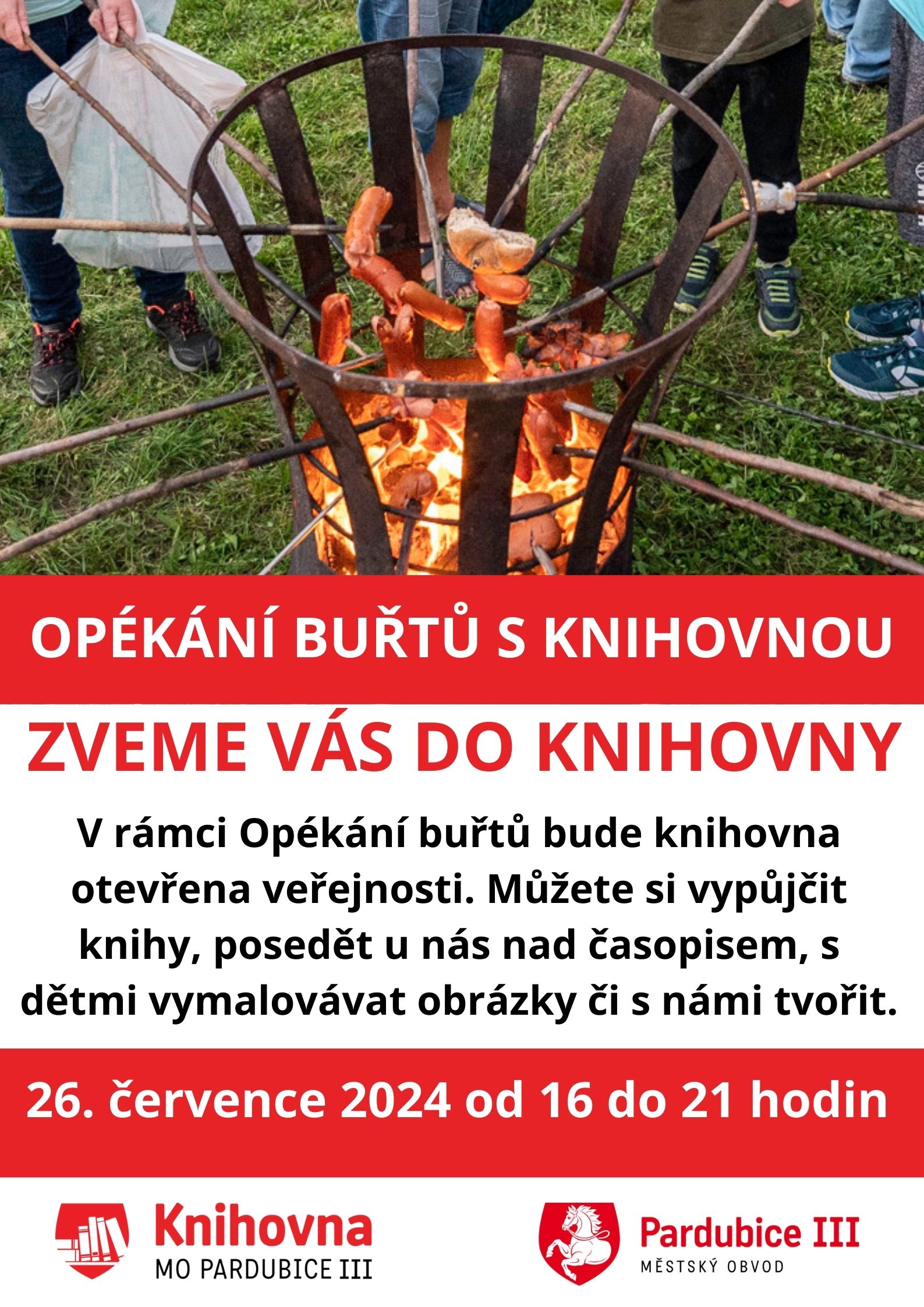 Opékání buřtů s knihovnou, 26.7.2024 od 16 do 21 hodin