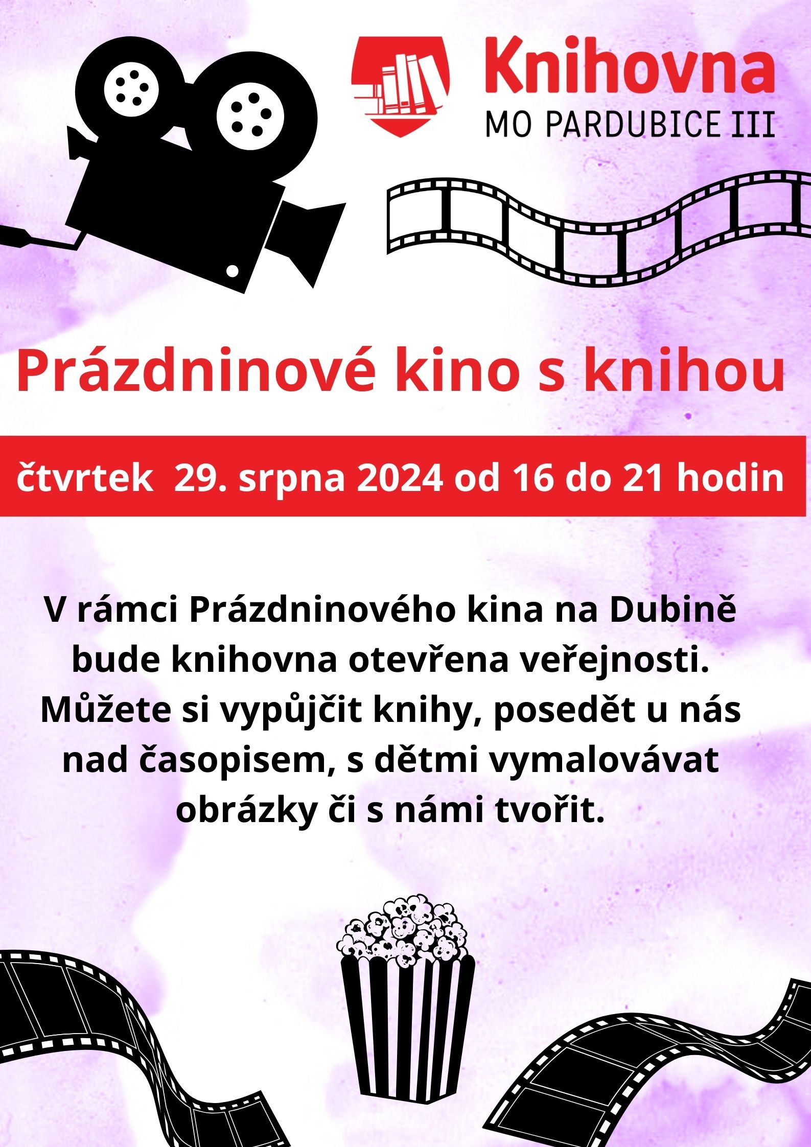 Prázdninové kino s knihovnou, 29.8.2024 od 16 do 21 hodin