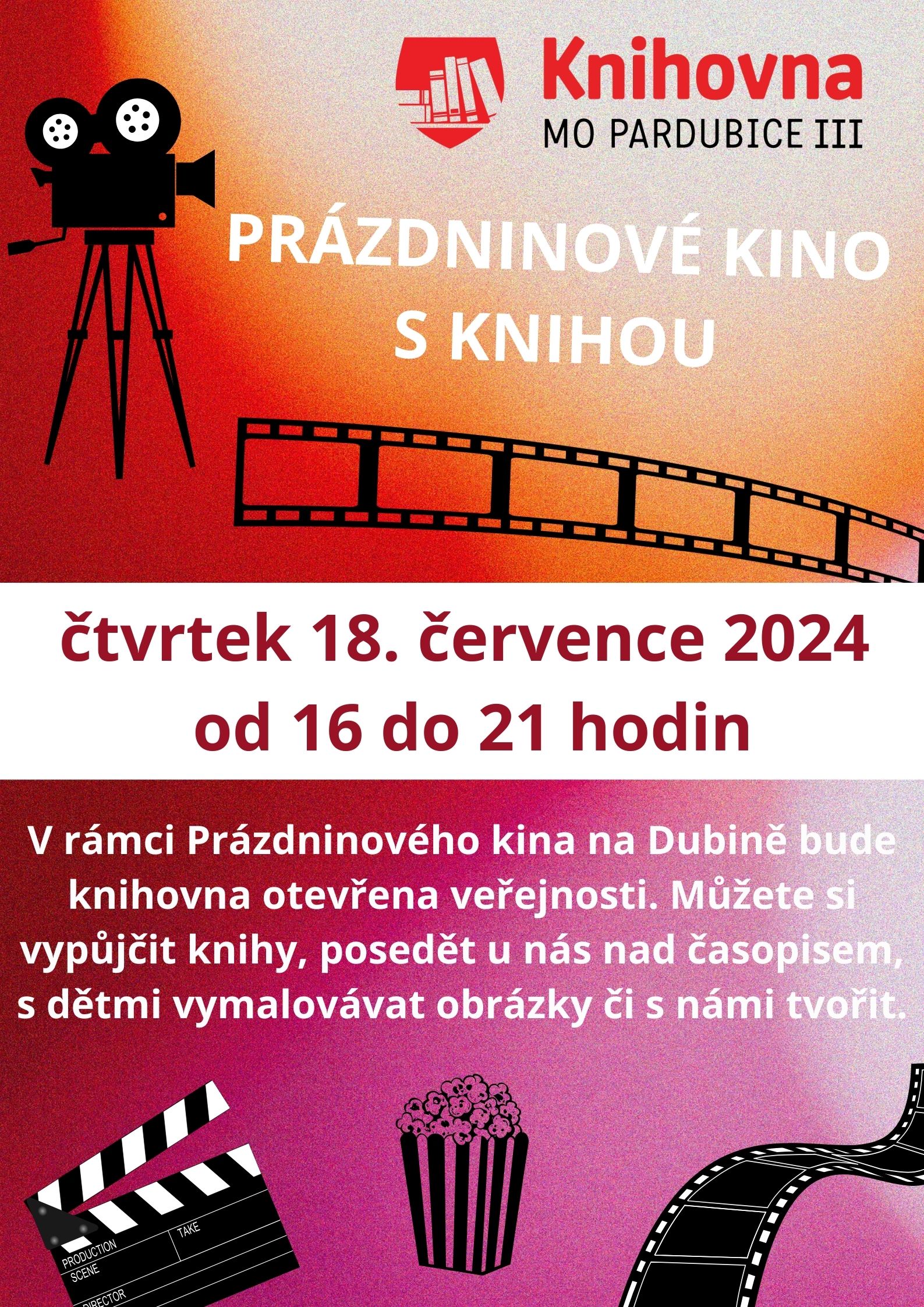 Prázdninové kino s knihovnou, 1.8.2024 od 16 do 21 hodin