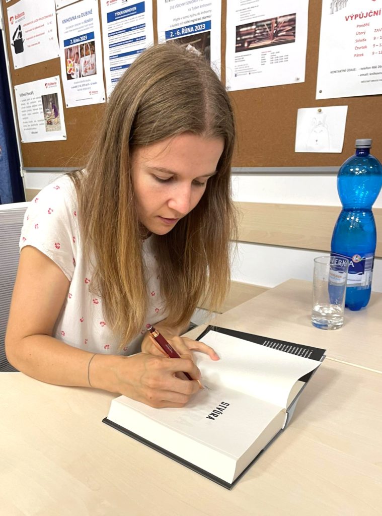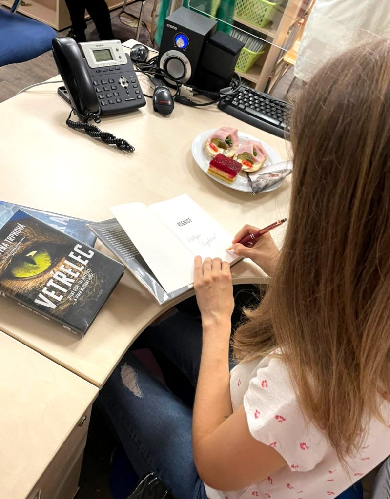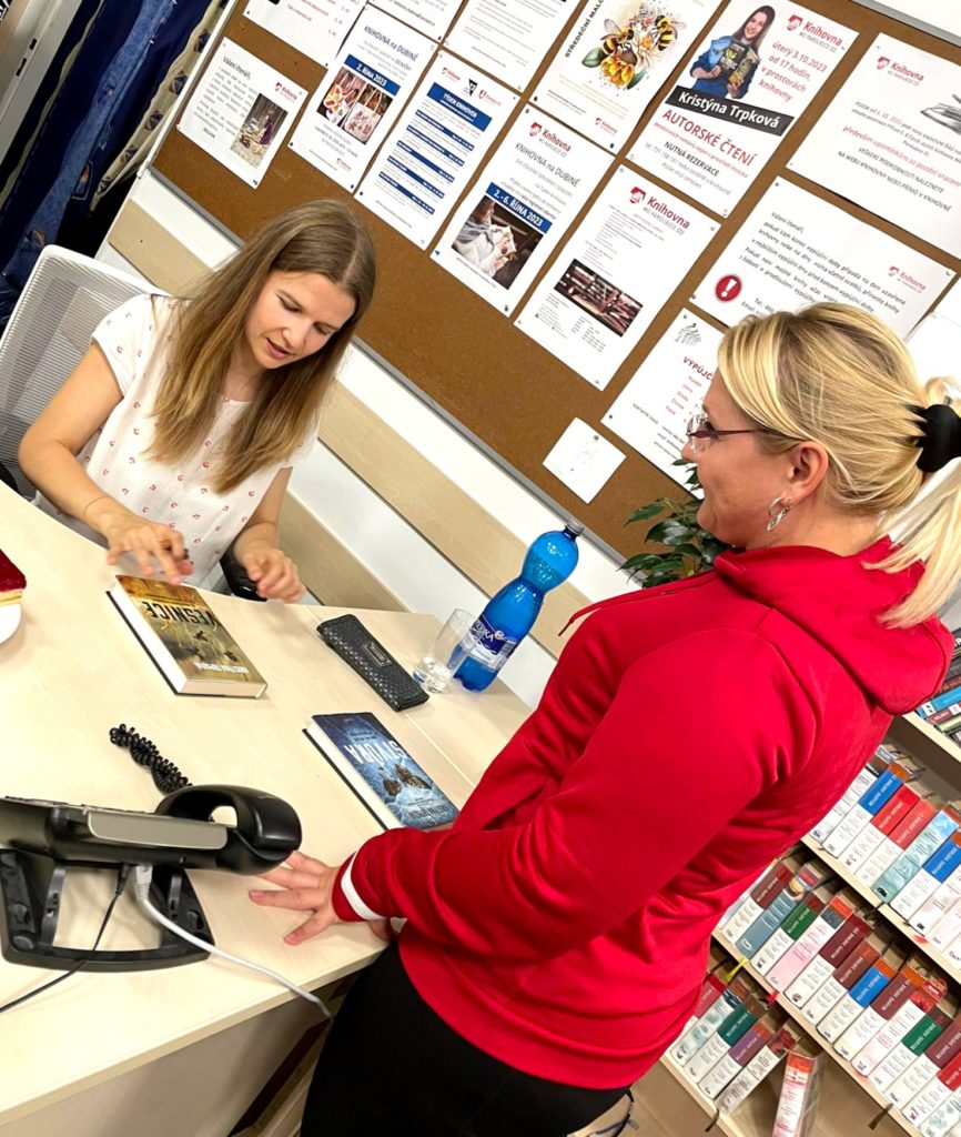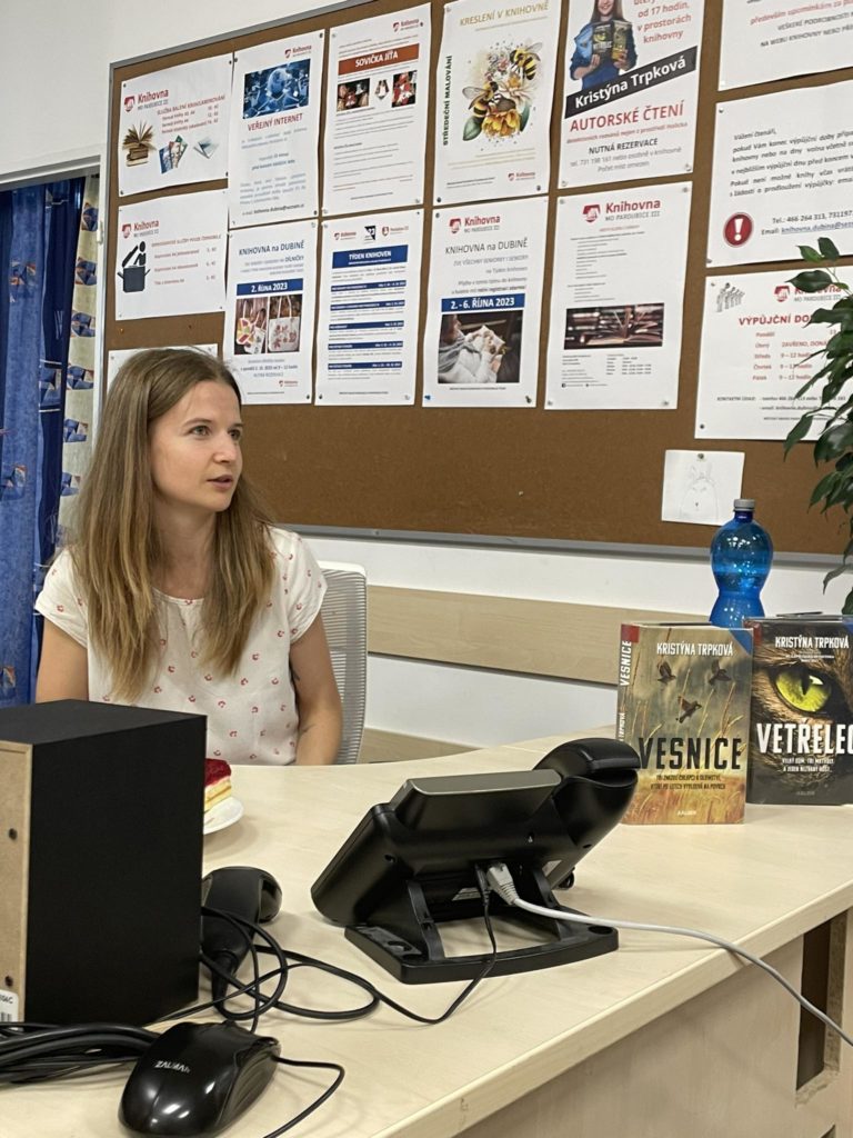 V úterý 3.10.2023 jsme připravili pro čtenářskou veřejnost první autorské čtení. První vlaštovkou byla Kristýna Trpková, úspěšná česká spisovatelka detektivní trilogie s vyšetřovateli Laurou Linhartovou a Adamem Benešem. Úžasná atmosféra, poutavé čtení z její poslední knihy Vetřelec a spousty dotazů, to byl pohodový večer u nás v knihovně.
