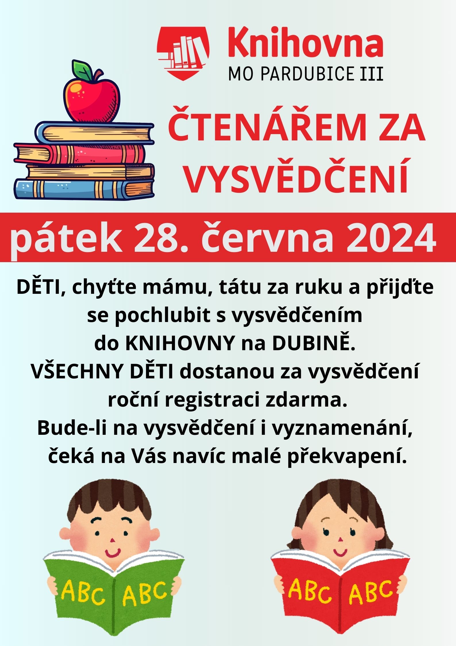 DĚTI, chyťte mámu, tátu za ruku a přijďte se pochlubit s vysvědčením do KNIHOVNY na DUBINĚ. VŠECHNY DĚTI dostanou za vysvědčení roční registraci zdarma. Bude-li na vysvědčení i vyznamenání, čeká na Vás navíc malé překvapení.