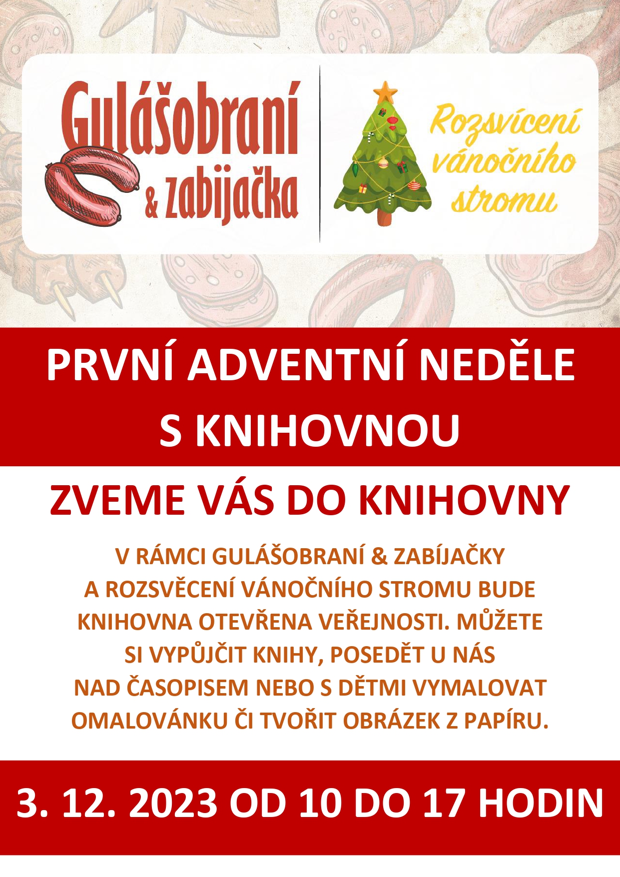Zveme Vás do knihovny. V rámci Gulášobraní & Zabíjačky a Rozsvěcení vánočního stromu bude knihovna otevřena veřejnosti. Můžete si vypůjčit knihy, posedět u nás nad časopisem nebo s dětmi vymalovat omalovánku či tvořit obrázek z papíru.