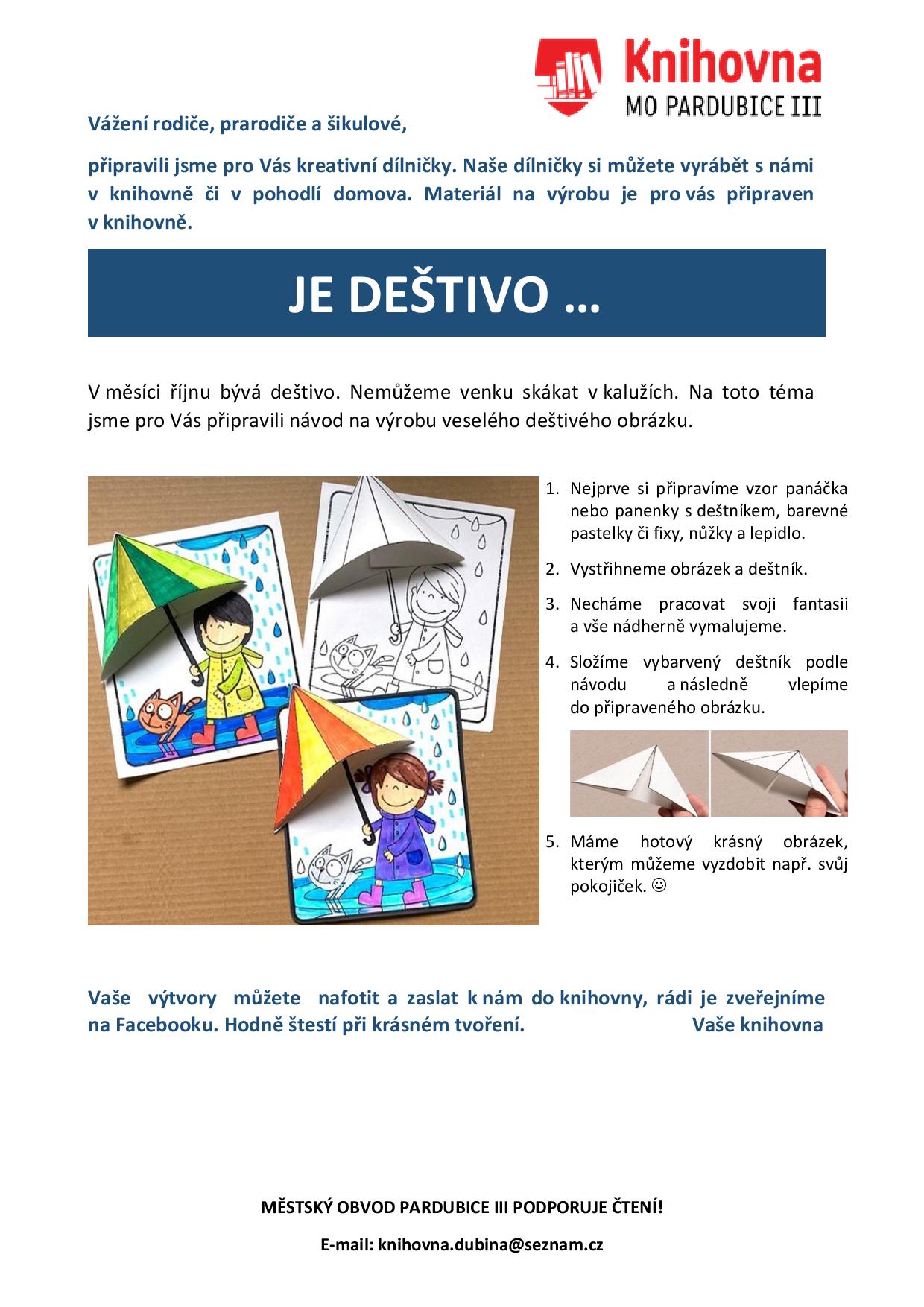 V měsíci říjnu bývá deštivo. Nemůžeme venku skákat v kalužích. Na toto téma jsme pro Vás připravili návod na výrobu veselého deštivého obrázku.