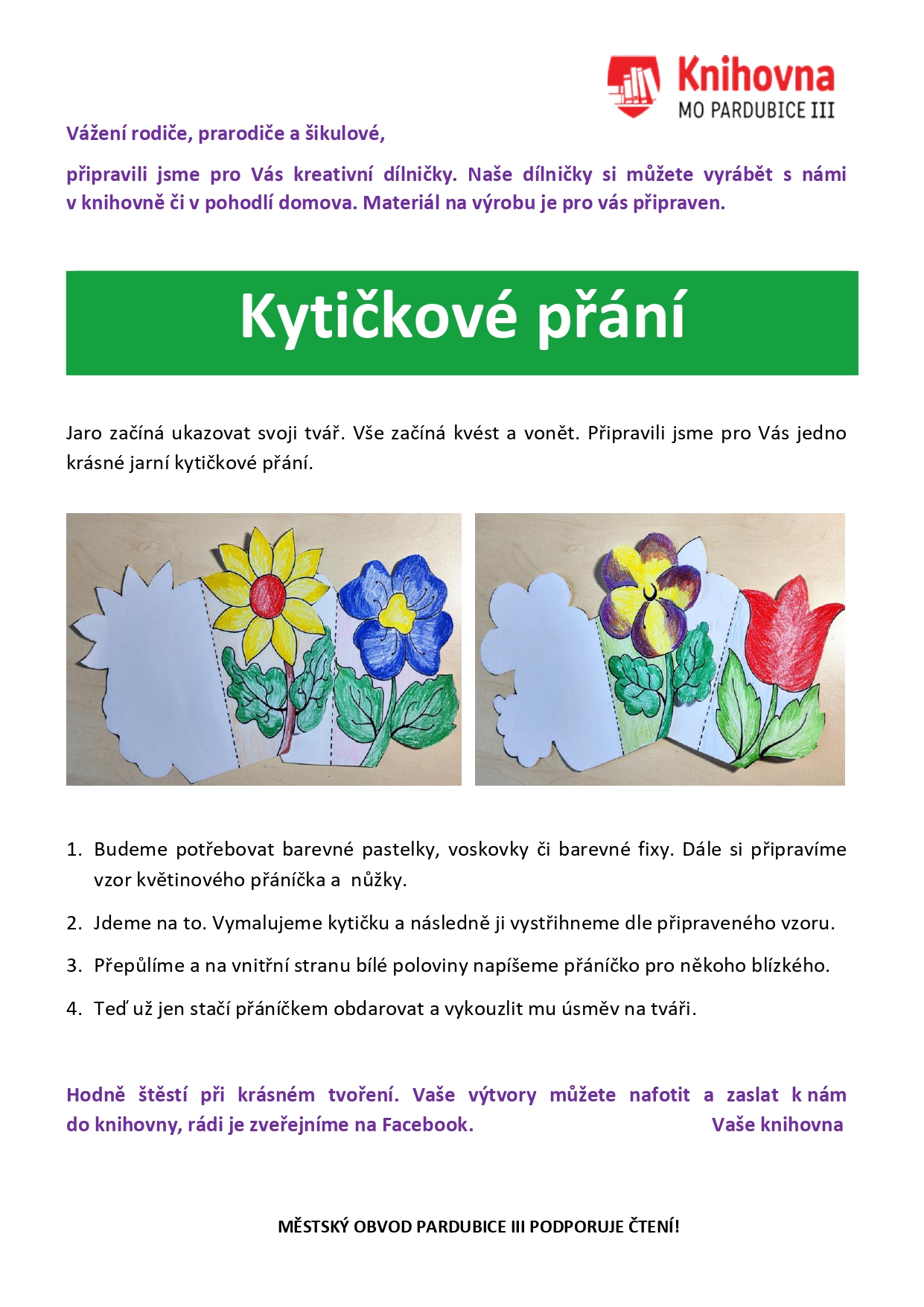 Hodně štěstí při krásném tvoření. Vaše výtvory můžete nafotit a zaslat k nám do knihovny, rádi je zveřejníme na Facebook. Vaše knihovna