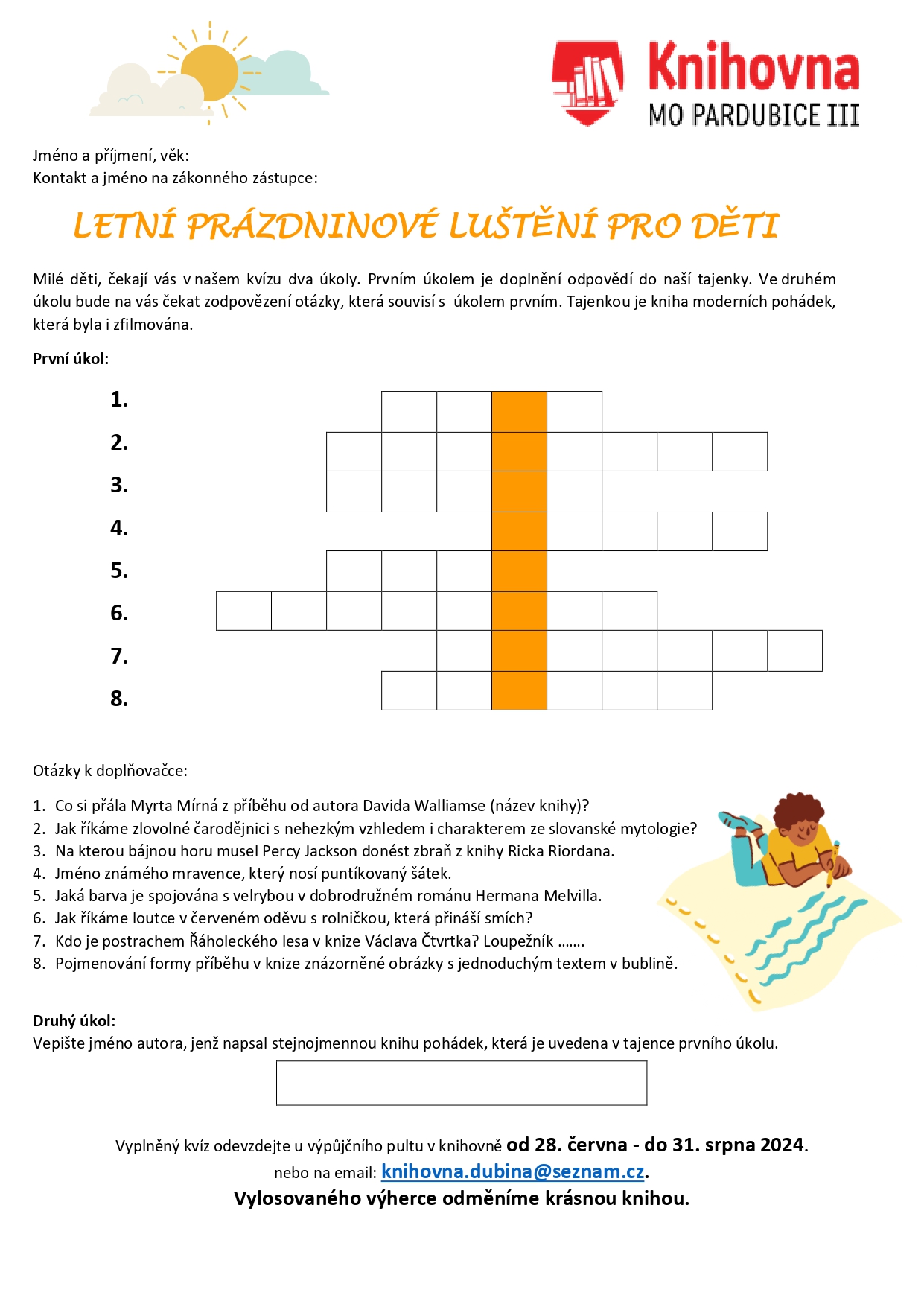 Vyplněný kvíz odevzdejte u výpůjčního pultu v knihovně od 28. června – do 31. srpna 2024 nebo na email: knihovna.dubina@seznam.cz.