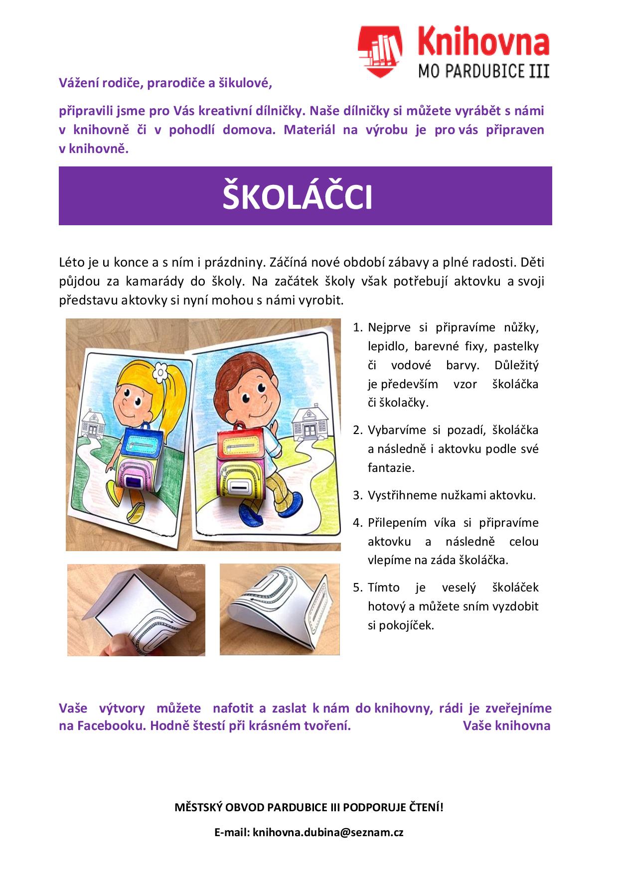 Léto je u konce a s ním i prázdniny. Záčíná nové období zábavy a plné radosti. Děti půjdou za kamarády do školy. Na začátek školy však potřebují aktovku a svoji představu aktovky si nyní mohou s námi vyrobit.