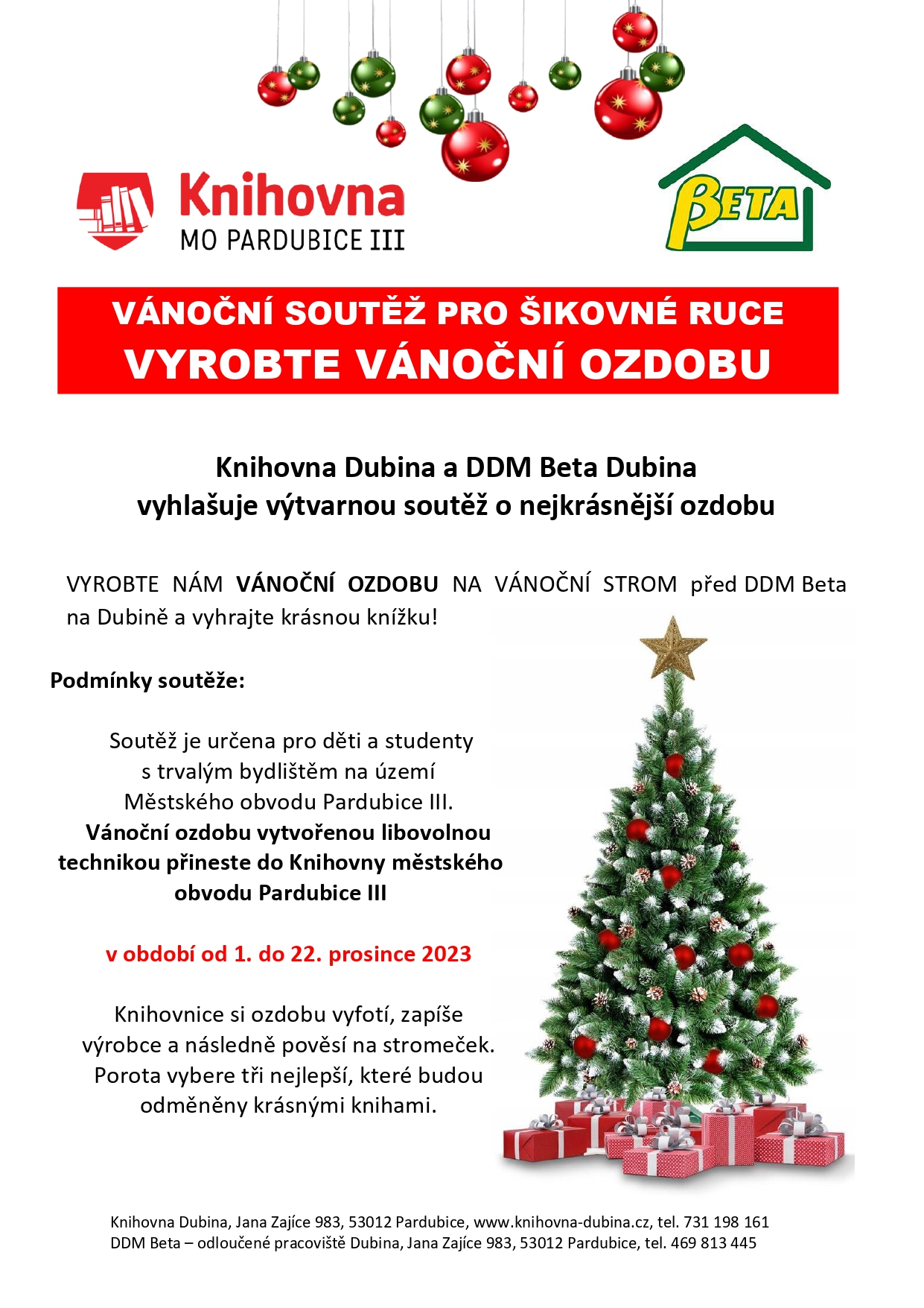 Soutěž je určena pro děti a studenty s trvalým bydlištěm na území Městského obvodu Pardubice III. Vánoční ozdobu vytvořenou libovolnou technikou přineste do Knihovny městského obvodu Pardubice III v období od 1. do 22. prosince 2023 Knihovnice si ozdobu vyfotí, zapíše výrobce a následně pověsí na stromeček. Porota vybere tři nejlepší, které budou odměněny krásnými knihami. |