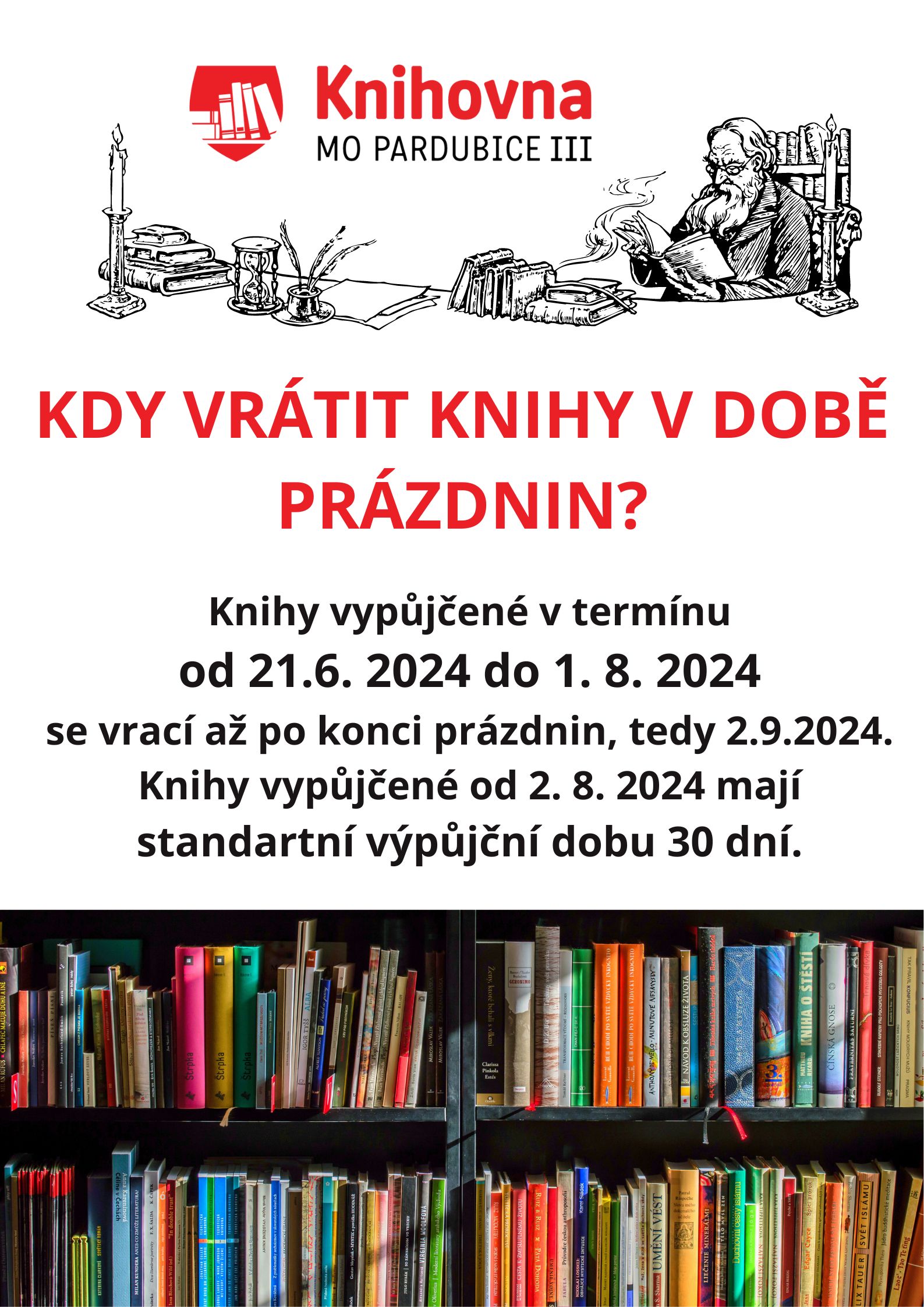 Knihy vypůjčené v termínu od 21.6. 2024 do 1. 8. 2024 se vrací až po konci prázdnin, tedy 2.9.2024. Knihy vypůjčené od 2. 8. 2024 mají standartní výpůjční dobu 30 dní.