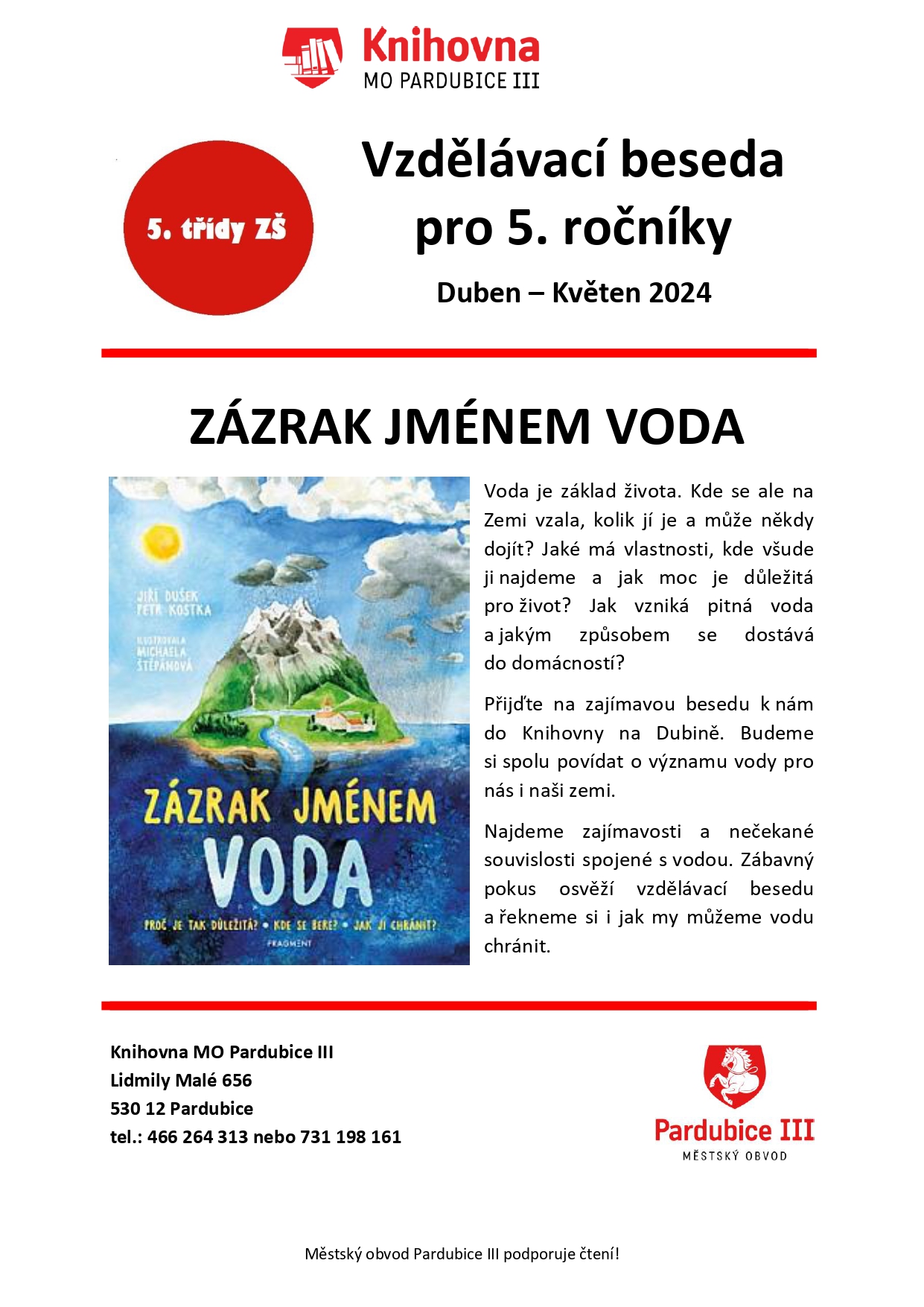 Přijďte na zajímavou besedu k nám do Knihovny na Dubině. Budeme si spolu povídat o významu vody pro nás i naši zemi.